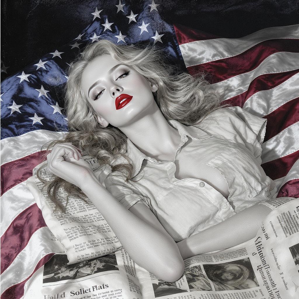 A harmonious blend of fresco, realism, and pop art, featuring a close-up of an enchanting blonde woman with striking red lipstick, wearing a collared oxford dress. She reclines upon an aged newspaper and a subtly depicted American flag, her image captured in the evocative style of black and white intimacy. Drawing inspiration from Mike Deodato and Jan Frans van Bloemen, her slender form radiates gentle lyricism, with lush, intricate details emerging through tenebrism-inspired shadows. The portrait conveys a sense of emotional distortion, influenced by Anton Fadeev and Lauren Faust, while echoing the delicate elegance of Léon Bakst. Subtle pops of blue, white, and red accent her presence, enhancing the artistic tapestry of the composition.