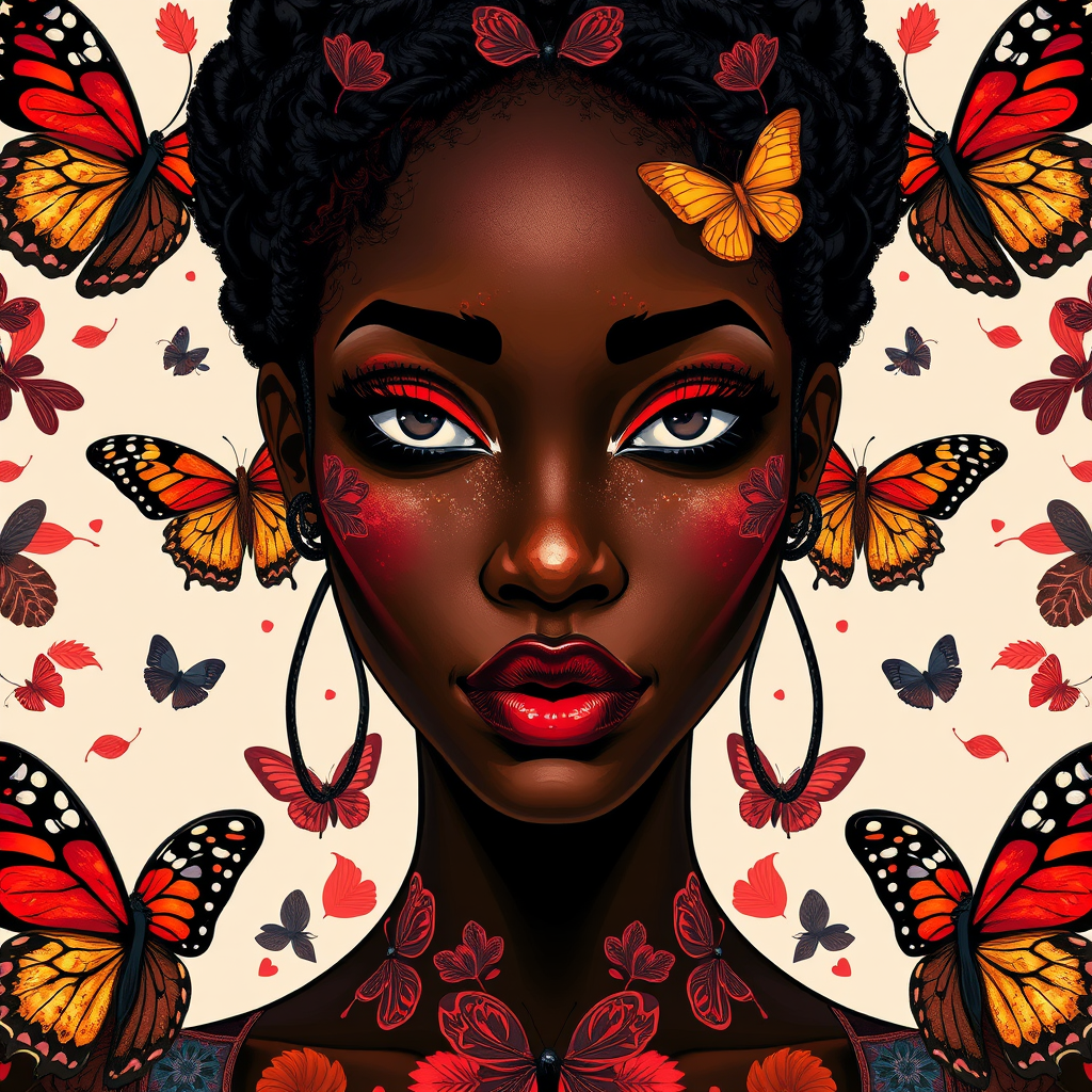 A harmonious depiction of a black woman in the style of an oil painting, featuring a seamless Damascus-inspired butterfly pattern. The composition is symmetrical, rendered as a high-quality vector illustration with intricate and detailed designs. Influenced by Tom Bagshaw, Greg Rutkowski, Makoto Shinkai, Lois Van Baarle, and Ilya Kuvshinov, this piece employs a luxurious color palette with splashes of color that accentuate the beauty of the subject. The strokes are ultra-precise with a mix of heavy and paint-dripping strokes, creating a dynamic and captivating visual. The artwork celebrates elegance and precision, focusing on the beauty and complexity of the subject with sharp, clean lines and a detailed portrayal.