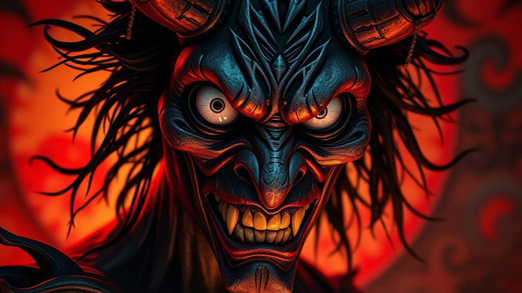 A haunting and nightmarish portrayal of an evil entity inspired by Japanese Oni culture, presented in a portrait view that is highly detailed and rendered in 8k resolution. The hyperrealistic artwork is created as splash art and concept art, featuring a mid-shot perspective with intricately detailed elements and rich color depth. The image is dramatically lit from the side, capturing 2/3 of the face angle with a vibrant, colorful background that enhances the eerie presence. The character is depicted with forbidding and distorted features, such as an asymmetrical face, mismatched eyes, and crooked lips, giving a sense of unease. Despite these unsettling traits, the composition maintains clarity and focus, avoiding any cut-off body parts or blurriness. The background elements complement the figure without distraction, creating a cohesive and striking piece of art that evokes both fear and intrigue.