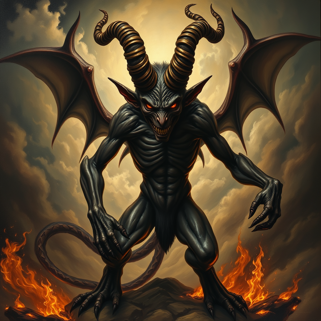 A haunting baroque oil painting depicts a menacing demon with eyes glinting like cold steel, its elongated limbs and sinewy body wrapped in shadows. The creature stands amidst a landscape of turbulent clouds and flickering flames, its skin a tapestry of swirling, dark hues. Intricate details adorn its fearsome visage, with ornate horns spiraling skyward, reminiscent of twisted, ancient branches. Despite its monstrous appearance, there's an unnerving elegance in its posture, a sinister smile playing at its lips suggesting a cruel intellect. The background, a dramatic clash of light and dark, highlights the creature's infernal majesty while rich textures bring an unsettling vitality to its otherworldly presence.