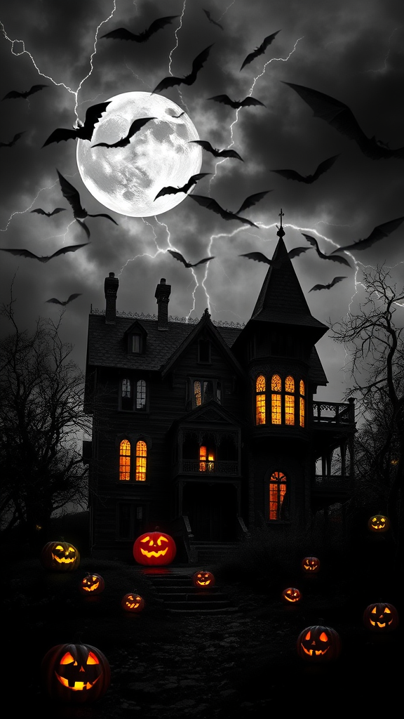 A haunting black and white image of a spooky, decaying mansion shrouded in mystery, with vividly glowing jack-o-lanterns casting eerie colors, surrounded by a twisted, haunted forest. The tempestuous sky crackles with lightning, silhouetting the swirling bats against a ghostly full moon that peeks through the stormy clouds.