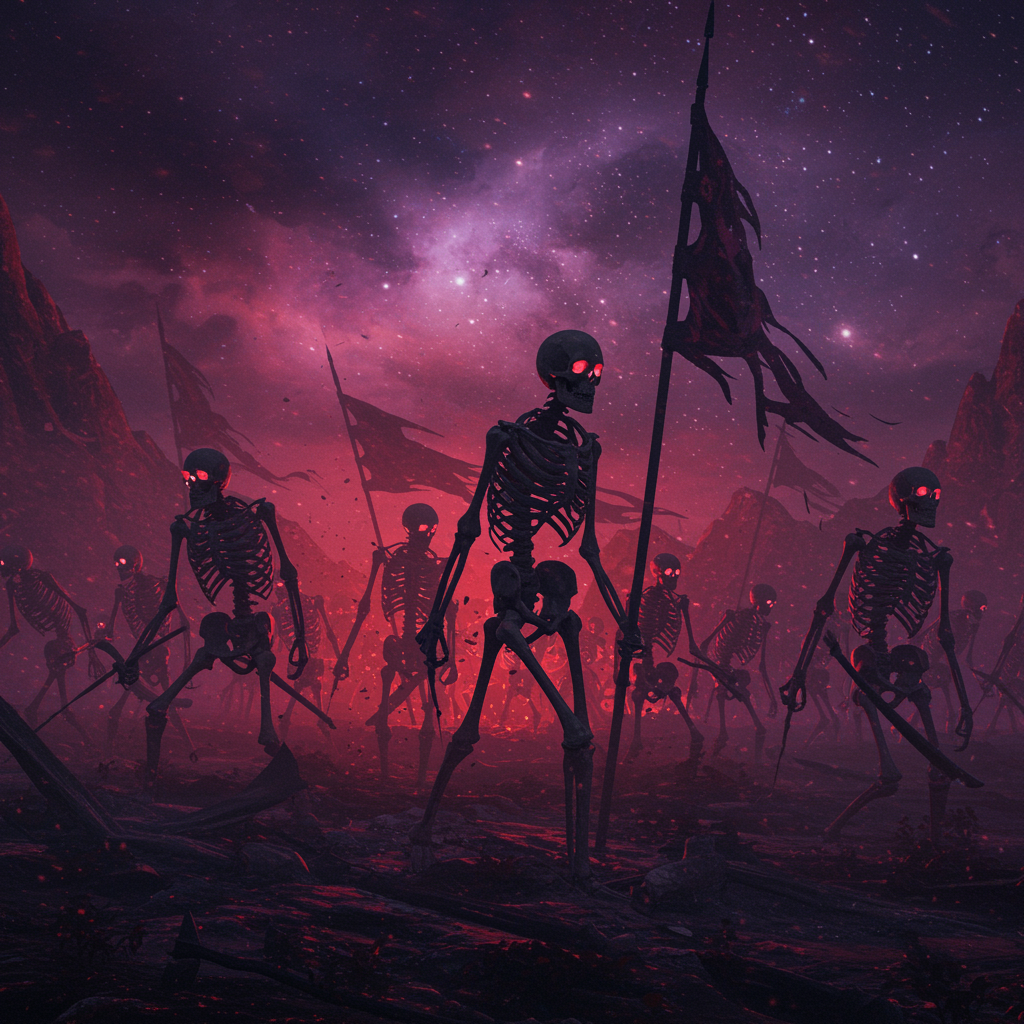 A haunting fantasy scene featuring an army of skeletal warriors marching through a surreal landscape, where the celestialpunk atmosphere blends seamlessly with rich hues of dark purple and red. The skeletal figures glisten with hyper-realistic detail, evoking a sense of both ancient mysticism and futuristic technology. Inspired by the intricate style of Magali Villeneuve, the environment is lush with celestial elements, like distant nebulae illuminating the dark, brooding backdrop. This creates an enchanting fusion of eerie and mesmerizing beauty. The composition bears the signature of a master like Zacharias Martin Aagaard, capturing a sense of epic, timeless conflict, where each bone and fragment tells a story of battles long past and powers that transcend the realm of the living.