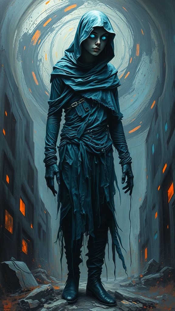 A haunting figure stands in ragged, futuristic clothing, its form stretching and twisting in an eerie blend of human and the unknown. The fabric hangs in tattered elegance, shimmering with metallic hues that shift from deep indigo to glistening emeralds, reflecting its unsettling environment. The background swirls in an intricate dance of chaotic dreamscapes, merging elements of urban decay with alien landscapes. Its eyes pierce through the canvas with an eerie translucence, ghostly yet vivid, each pupil a swirling abyss, drawing the viewer into a state of discomfort and fascination. The color palette is an evocative mix of stark blacks, piercing blues, and fiery oranges, creating a contrast that adds to the disturbing allure of the scene. This surrealist expressionist creation invites the observer into a world where reality is shredded and reformed, leaving behind an imprint of an unsettling yet captivating nightmare.