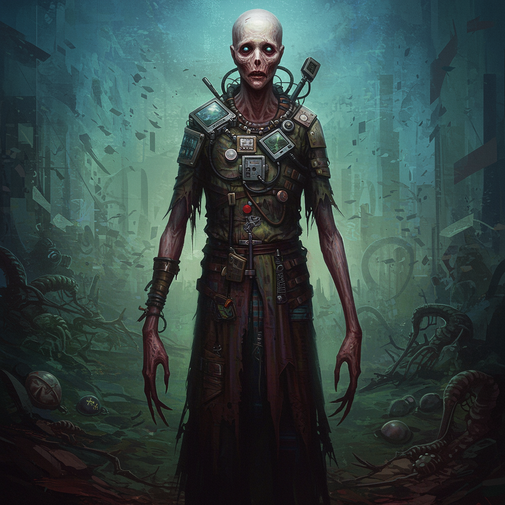 A haunting full-length figure dressed in futuristic, tattered clothing emerges from the shadows, embodying the essence of surrealist expressionism. The colors are evocative and unsettling, a swirling mix of deep blues, blood reds, and sickly greens that blend chaotically across the canvas. The creature's skin is pale, almost translucent, with veins faintly visible beneath the surface, adding to its ethereal presence. Its ghostly cold eyes stare ahead, unnervingly fixated, the pupils are swirling vortices of black that draw the viewer in, hinting at an abyss beyond understanding. The hands, elongated and thin, seem to reach out in silent anguish, fingers ending in sharp, almost claw-like tips. Around its neck, a cluster of futuristic gadgets and remnants of technology hang like a distorted necklace, glowing faintly with an eerie luminescence, casting strange shadows on its gaunt face. The background is a distorted landscape, with fragmented cityscapes and organic forms merging into one another, creating a sense of impending doom. The atmosphere is one of despair and isolation, evoking a world teetering on the brink of collapse.