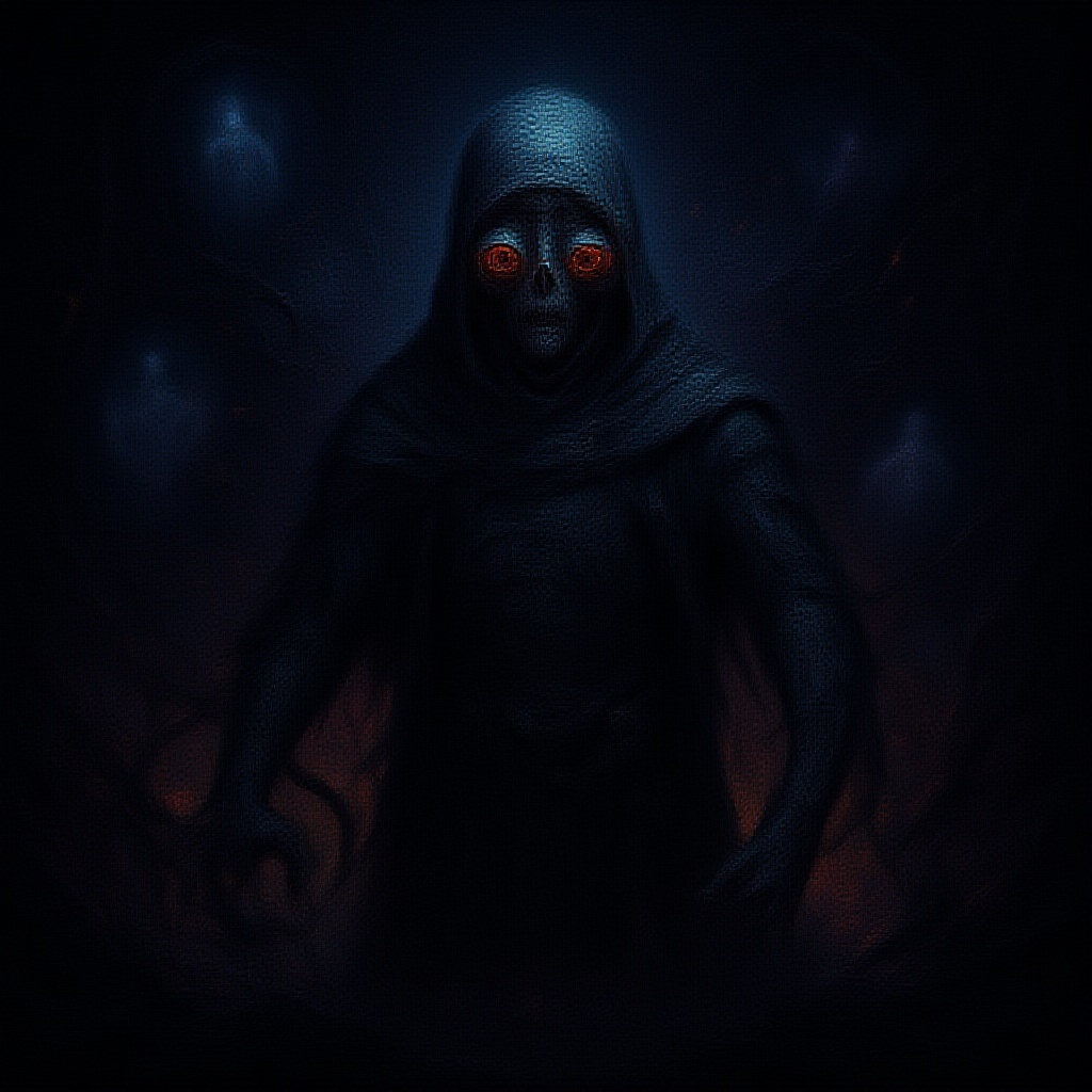 A haunting full-length image of an otherworldly figure shrouded in futuristic ragged clothing emerges from the dark canvas, melding elements of surrealist expressionism. The creature's ghostly cold eyes with terrifying, swirling pupils pierce through the composition, drawing forth an unsettling sense of unease. Its elongated limbs and distorted body hover against an evocative color scheme of icy blues and deep, shadowy purples, punctuated by streaks of fiery orange and crimson that hint at hidden turmoil. The textured backdrop, a chaotic fusion of tangled wires and enigmatic symbols, intensifies the dystopian feel, while faint, spectral forms hover in the periphery, whispering of lost souls. The artwork exudes an air of dread and mystery, inviting the viewer to explore the delicate balance between curiosity and fear.