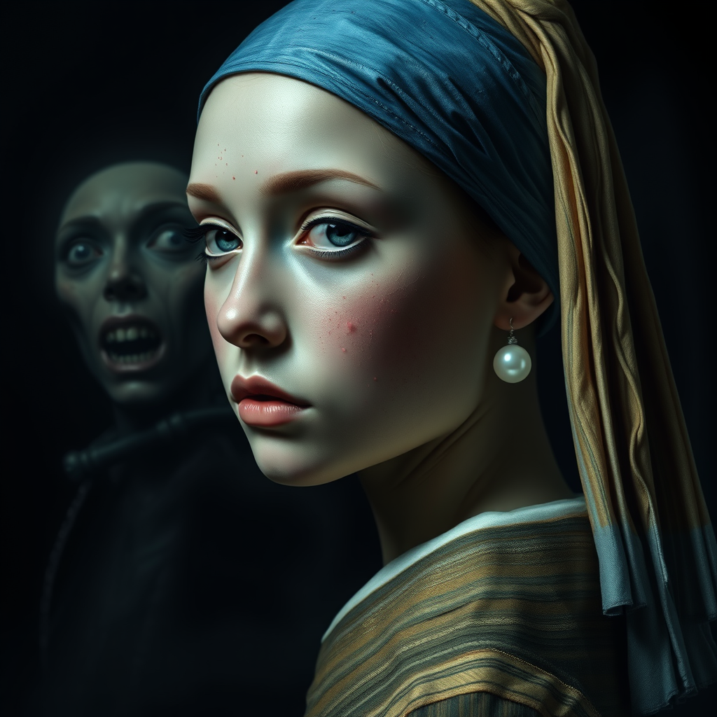 A haunting, high-definition reimagining of a girl with a pearl earring, depicted in stunning 8k ultra-high definition, showcasing remarkable anatomical precision, set against a chilling, Lovecraftian horror background. The scene evokes the dark, gothic essence of H. R. Giger and the surreal, fantastical elements of Zdzisław Beksiński's art. The focus is on capturing the finest textures and ethereal, otherworldly lighting, as if illuminated by the eerie glow of an ominous, full moon casting mysterious shadows.