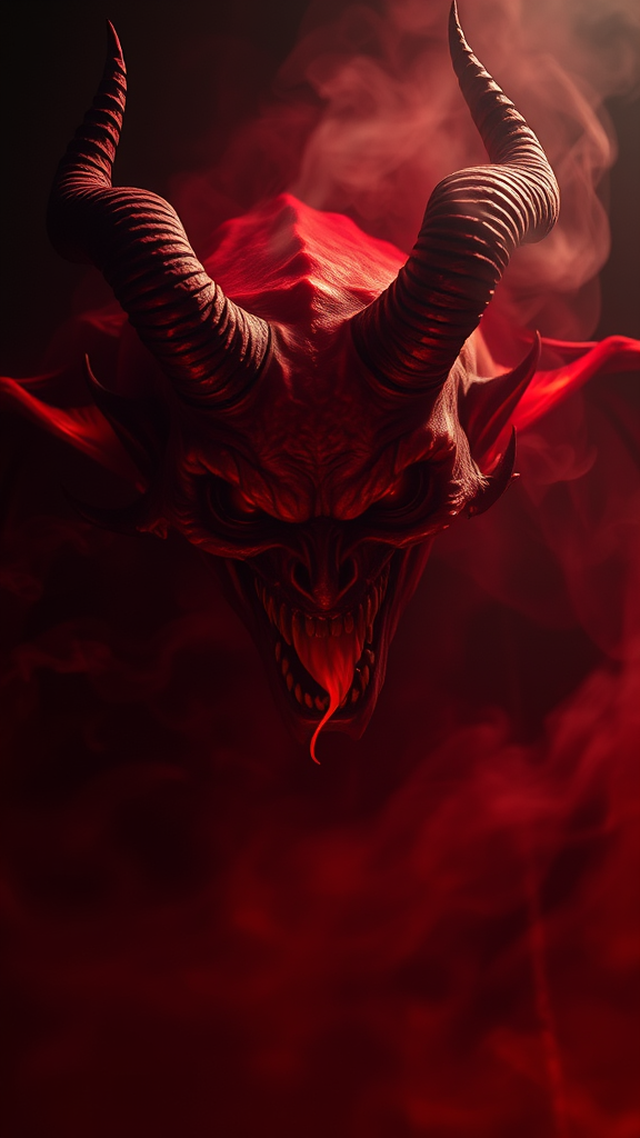 A haunting image of an incredibly frightening and menacing demon from the depths of hell, enveloped in a reddish hue, illuminated with dramatic backlighting that casts long shadows, swirling smoke surrounds it, conveying a sense of melancholic dread, dynamic lighting enhances its sinister features, set against a foreboding dark backdrop.