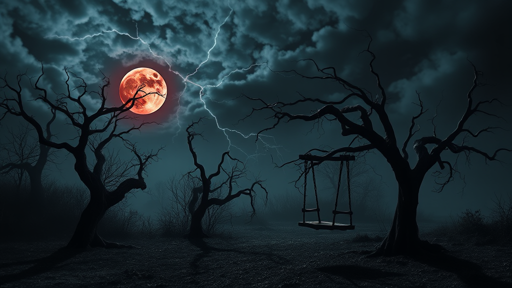 A haunting landscape under a blood-red moon, where twisted, leafless trees with gnarled branches reach out like skeletal fingers. Shadows cast eerie figures on the ground, while a dense fog blankets the terrain. In the foreground, a dilapidated, creaking wooden swing sways gently, though there's no wind, evoking a sense of a ghostly presence. The sky is filled with swirling dark clouds, punctuated by occasional flashes of lightning, illuminating the sinister scene with chilling sparks of light.