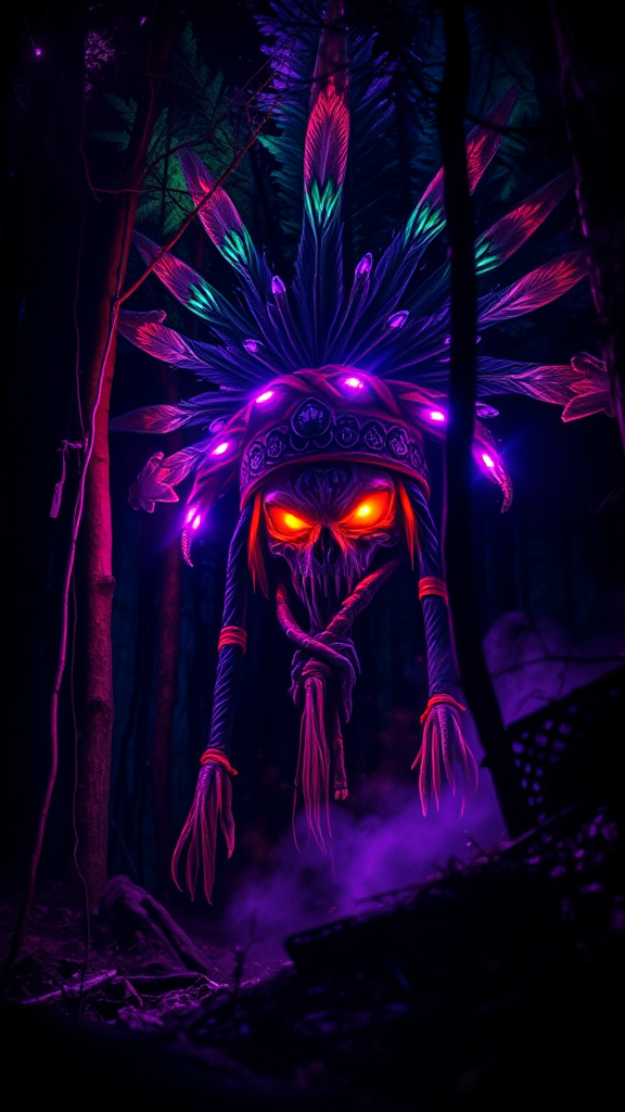 A haunting Native American evil spirit lurking in the dark woods captured through the mysterious lens of night photography, with intense color saturation highlighting the vivid energy explosions surrounding it, reminiscent of the striking style of EC Comics, the dark forest illuminated with surreal colors and eerie, glowing eyes piercing through the shadows, creating an atmosphere of otherworldly vibrant energy and eerie excitement.
