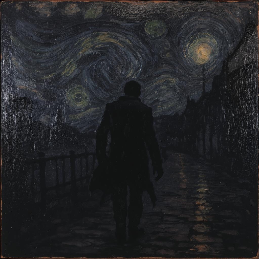 A haunting oil painting captures the silhouette of a male figure lurking on a dimly lit street, evoking the style of Van Gogh with swirling starry night vibes. The expressionist scene is dominated by gloomy, dark tones that convey unforgettable emotional depth. The figure is blurred and grainy, with imperfectly rendered anatomy and limbs that enhance the unsettling mood. The composition feels both plastic and poorly drawn, adding a layer of abstraction that intensifies the mystery and tension of the moment.