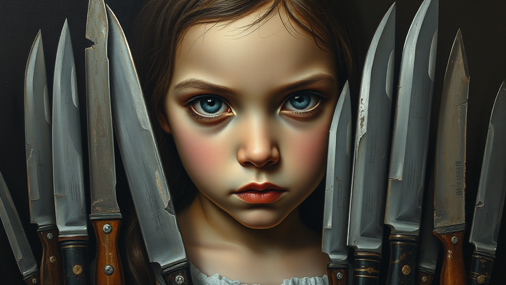 A haunting oil painting portrait of a young girl with vacant eyes and an intense gaze, featuring a grainy texture reminiscent of Diego Velazquez's style, surrounded by an array of knives, with a rough and raw aesthetic, capturing a sense of deep mystery and intrigue.