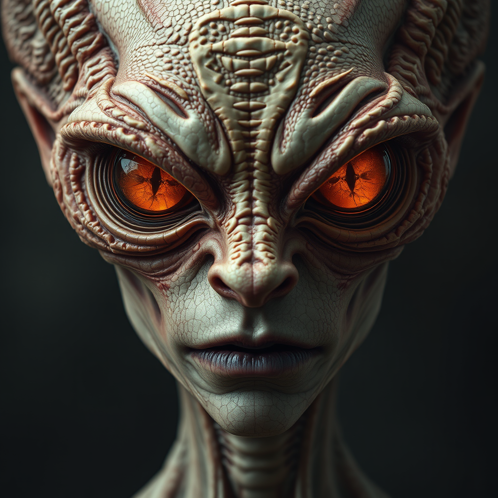 A haunting portrait capturing the essence of sorrow, featuring heavily exaggerated features that transcend human form, highlighted by deep, dark amber orange reptilian humanoid eyes. Its ethereal presence is a figment of imagination, resonating with eerie familiarity to the human visage while invoking an unsettling yet captivating beauty. The style draws inspiration from the surrealistic and biomechanical artistry reminiscent of Julie Bell and H.R. Giger, blending intricate details with imaginative interpretation.