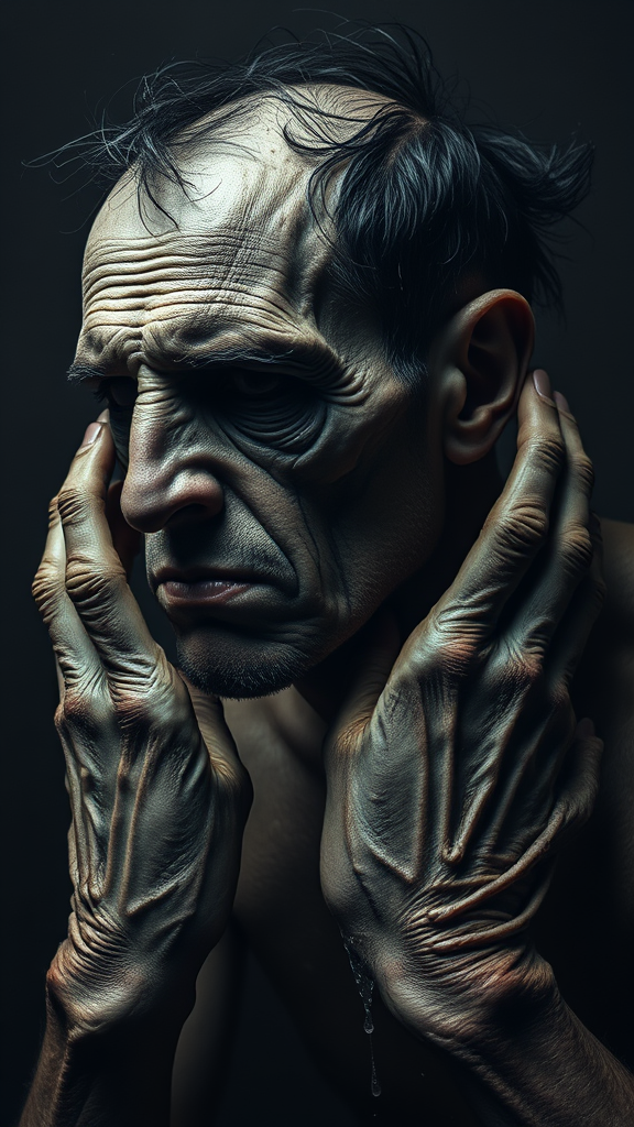 A haunting portrait of a broken, brutal man, isolated in solitude. The composition is dark and gloomy, evoking deep emotional resonance and unforgettable horror. His features are intricate and deeply etched, suggesting the torment within. The image bears signs of distortion and imperfection, like a visual symphony of jpeg artifacts, blurriness, and deformities. His face and hands appear poorly drawn and mutated, with disfigured proportions and malformed limbs, creating a mesmerizing yet disturbing effect. Extra limbs and elongated neck add a surreal touch, while signs of dehydration hint at his suffering. The texture is coarse, with elements that seem cloned or cloned face, enhancing the eerie atmosphere. The overall impression is one of raw intensity and profound emotion, leaving an indelible mark on the viewer's psyche. The image is marred by hints of signature, watermark, or camera marks, adding to its enigmatic allure.