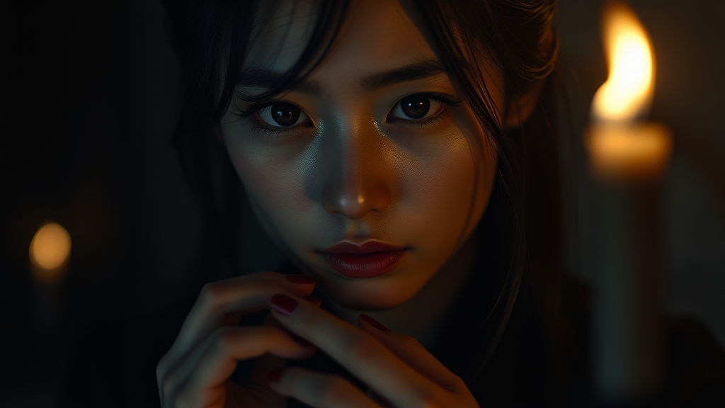 A haunting portrait of a young Asian woman captured in a moment of profound loss and despair. Her eyes, filled with a deep sorrow, tell a silent story of what she once had. The intricate details of her pain are evident as a single tear mingles with blood that gently traces a path down her cheek. The atmosphere is enveloped in muted tones and deep shadows, creating a somber setting that reflects her internal turmoil. Her delicate hands clutch a small, worn keepsake, a tangible reminder of her past life. The scene is illuminated by flickering candlelight, casting an ethereal glow and highlighting the rich textures of her traditional attire, which contrasts with the modern world from which she feels isolated. This 4K visual masterpiece delves into the horror and resilience of a young woman grappling with the weight of starting anew.