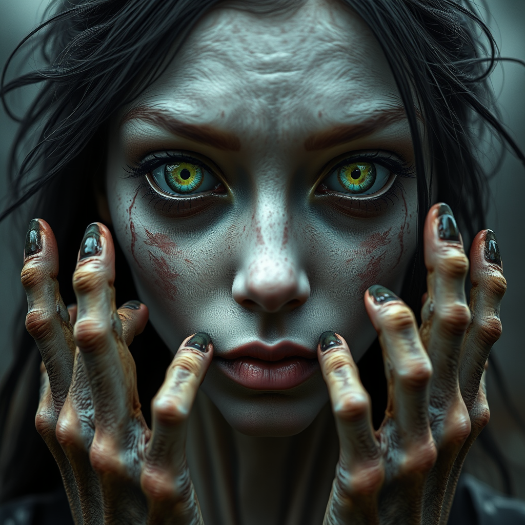 A haunting portrait showcasing a detailed face with mesmerizing green eyes, set against a backdrop of an apocalyptic world intertwined with occult and Lovecraftian themes. The face displays an eerie allure, with subtle deformities in the iris and pupils, creating a cross-eyed effect. The expression hints at a powerful incantation, adding a mystical aura to the image. The character's hands, exhibiting extra fingers and mutated forms, are positioned to suggest an enigmatic gesture. The high-definition imagery, rendered in 16k UHD and HDR quality, brings out every nuance, while imperfections like jpeg artifacts and slight cropping add an unsettling authenticity to the scene. The long neck and the slightly off-centered framing contribute to the surreal atmosphere, making the portrait a captivating blend of beauty, mystery, and the bizarre.