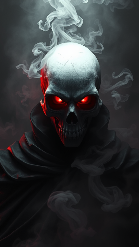 A haunting portrayal of death, featuring a highly detailed skull-faced figure set against an atmospheric backdrop, inspired by the artistry of Dustin Nguyen, Akihiko Yoshida, Greg Tocchini, Greg Rutkowski, and Cliff Chiang. The scene captures the essence of Dishonored and Bravely Default, highlighting a striking contrast with vibrant yet somber red tones, enveloped in a black and white color scheme. Presented as an epic extreme long shot, volumetric lighting casts eerie smoke volutes, enhancing the moodiness of the scene. Rendered in octane for exceptional detail, the composition is captured in breathtaking HQ at 8K resolution, maintaining a balanced aspect ratio of 1:2. The subtle addition of ethereal textures and an abstract background adds depth, enriching the visual narrative while staying true to the original concept.
