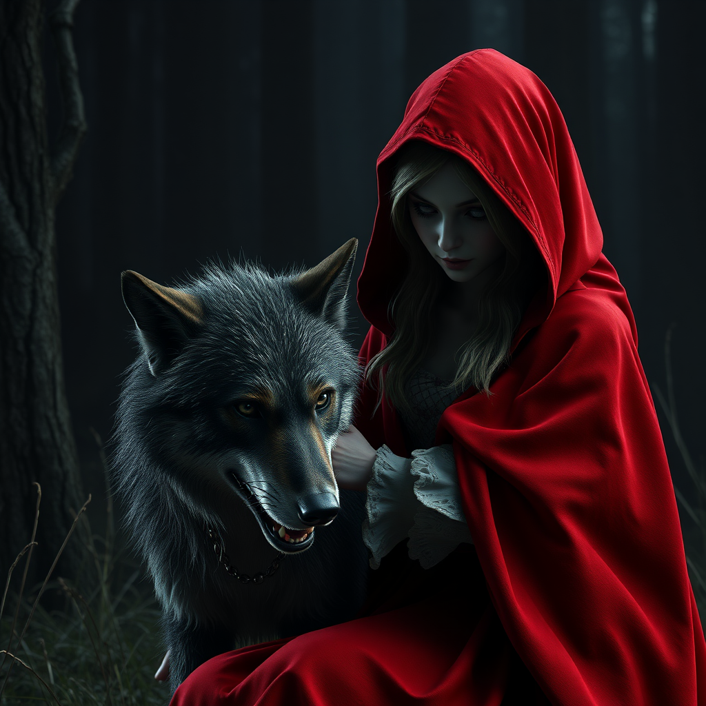 A haunting rendition of Red Riding Hood with a tamed yet menacing wolf by her side; the atmosphere dark and macabre, evoking a sense of lingering dread. Rendered in hyperrealism, the scene captures every detail with photorealistic precision in stunning 8k quality. Utilizing the Unreal Engine, the 3D render showcases an expressive and surreal landscape where shadows dance ominously, creating a chilling yet mesmerizing visual experience.