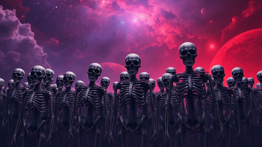 A haunting scene emerges, revealing a legion of intricately detailed skeletons set against a celestial backdrop of dark purple and deep red hues. Inspired by the art styles of Magali Villeneuve, the composition evokes a celestialpunk atmosphere fused with dark and brooding elements. The artwork captivates with its realistic hyper-detail, reminiscent of the works of Zacharias Martin Aagaard, delivering a mesmerizing tapestry of otherworldly beauty.