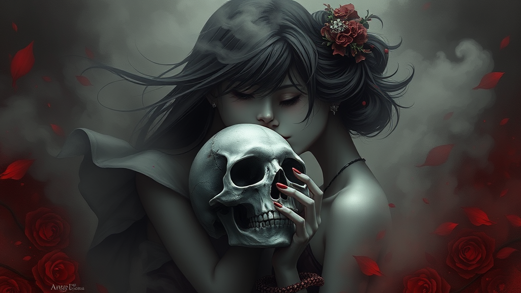 A haunting scene featuring a woman tenderly kissing a skull, enveloped in an ethereal mist, capturing the delicate elegance of Japanese-inspired art. The surreal ambiance is infused with gothic undertones, merging seamlessly with a strong sense of realism. The color palette is dominated by muted grays and deep crimson hues, creating a striking contrast reminiscent of black and white portraits. The woman’s design is anime-inspired, with intricate details highlighting her flowing hair and expressive eyes. The composition is elongated and narrow, adding to the dramatic tension, echoing the masterful storytelling seen in Andreas Rocha’s work.