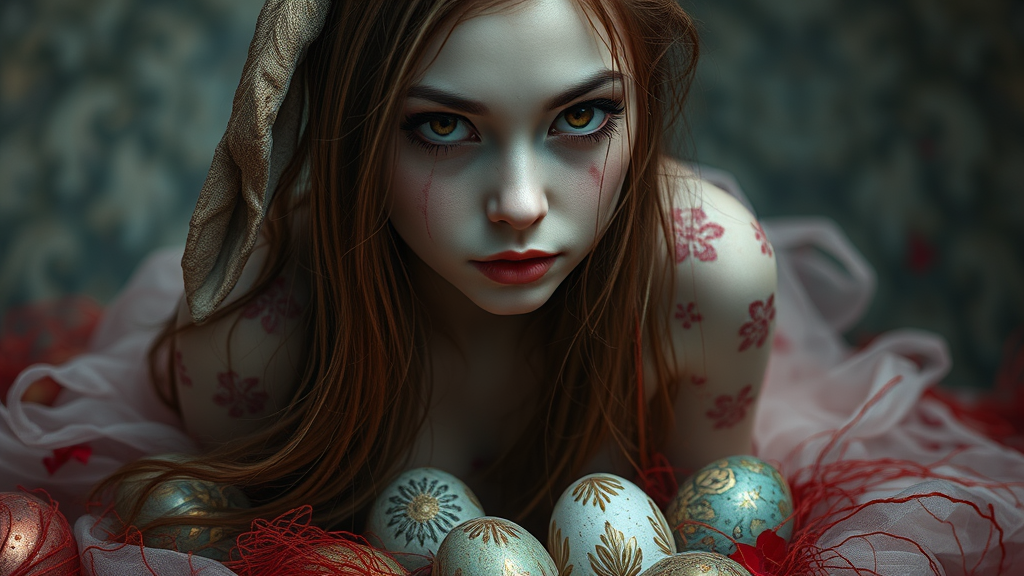 A haunting scene of a full-body portrait featuring a woman with delicate rabbit-like features, surrounded by vibrant, intricately decorated eggs. Her long hair cascades down her back, streaked with a pattern reminiscent of crimson threads. Her eyes, deep and enigmatic, gaze forward with an otherworldly calm, while subtle traces of dark red stain her ethereal, flowing attire. The eggs glisten mysteriously, nestled around her feet, contrasting the surreal blend of innocence and a chilling aura that envelops her.