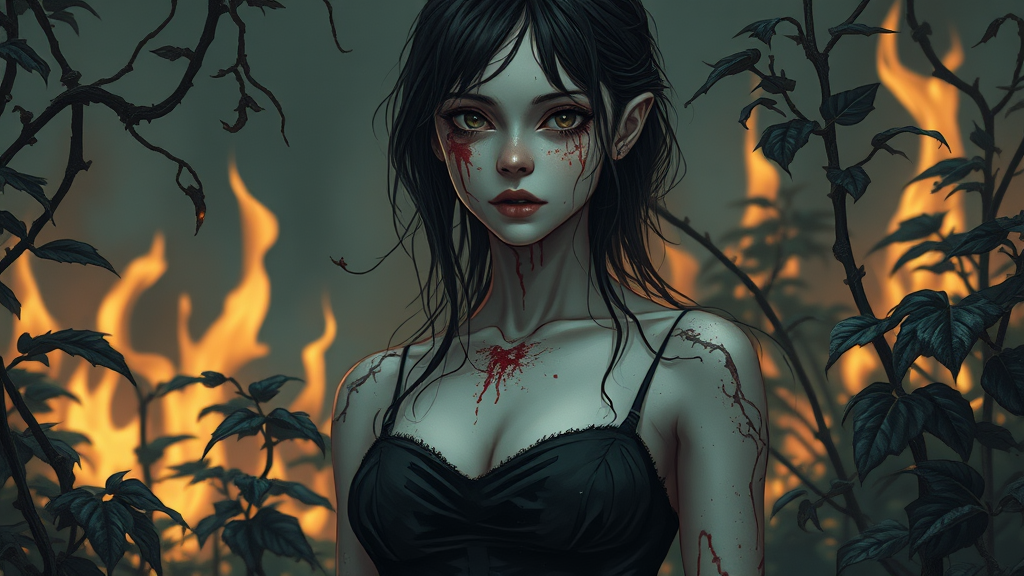 A haunting scene of a girl in a high-cut dress, tendrils of black veins coursing through her skin, dripping with inky oil. Predatory plants with sharp, ivy-like leaves encircle her, their textures almost tactile. Her face is a portrait of haunting beauty, shrouded in a gloomy atmosphere with splashes and smudges of deep red. She stands defiantly against a backdrop of flickering fire, the flames casting a dramatic glow. An illustration wrought in fine detail, painted with a rich palette. The scene unfolds in 8K resolution, with rim lighting accentuating her features, enveloped in a surreal, cinematic artificial lighting that bathes her in an otherworldly radiance.