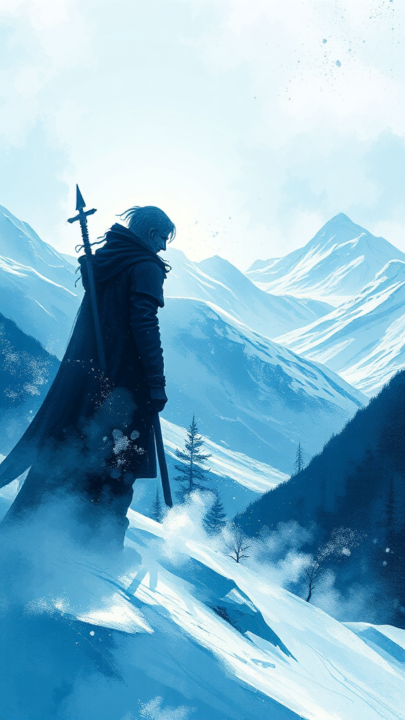 A haunting scene unfolds with a figure akin to the Witcher, captured through expressive brushwork exploration in a palette dominated by light blue and indigo hues. The composition presents an evocative silhouette against a backdrop of majestic, snow-capped mountainous vistas. The landscape, with its sweeping industrial undertones, looms large, suggesting a world where nature and human endeavor intersect. Mist and snow swirl around the figure, lending an ethereal quality, as each brushstroke dances with a life of its own, converging in a close-up that captures the raw emotion and mystique of the scene.