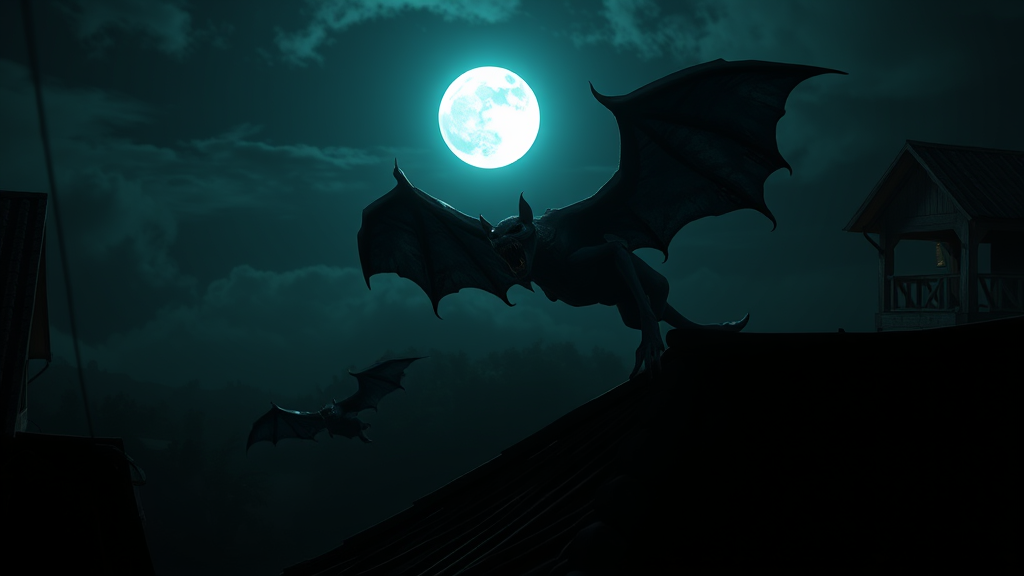 A haunting scene unfolds with a Manananggal, a terrifying female creature from Philippine folklore, featuring bat-like wings and sharp fangs, hovering ominously near a rooftop under the ghostly light of a full moon. Her severed upper body, rendered in hyperrealistic detail with 8k clarity, casts eerie shadows over the dark, desolate landscape. The atmosphere is intensely macabre and unnerving, evoking a sense of horror that pervades the night. Crafted using the advanced capabilities of Unreal Engine 3D rendering, the image combines photorealism with an expressive style, bringing this legendary monster to life in a vivid and terrifyingly surreal manner.