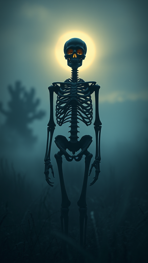 A haunting skeletal figure stands ominously in a mist-covered field, its hollow eye sockets peering through the twilight. The scene captures the eerie essence of a Mike Winkelmann character portrait, infused with the award-winning creativity of a CGSociety contest winner. The atmospheric environment art envelops the skeleton in shadows and ethereal light, enhanced by cutting-edge visuals reminiscent of #vfxfriday showcases. Rendered with the stunning realism of Unreal Engine 5, combined with the intricate details of CryEngine, the landscape feels both otherworldly and intensely immersive, beckoning viewers into a chilling, surreal tableau.