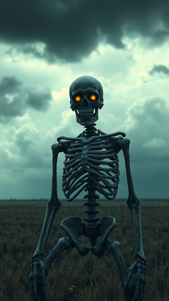 A haunting skeleton with eerie, glowing eyes stands ominously in an open field under a stormy sky, captured in a character portrait style reminiscent of Mike Winkelmann's surreal artistry, evoking the essence of a cgsociety contest winner. The landscape is richly detailed with environmental art, blending hyper-realistic elements to create an unsettling atmosphere, enhanced by the capabilities of Unreal Engine 5 and CryEngine, showcasing intricate textures and dynamic lighting effects often celebrated in #vfxfriday.