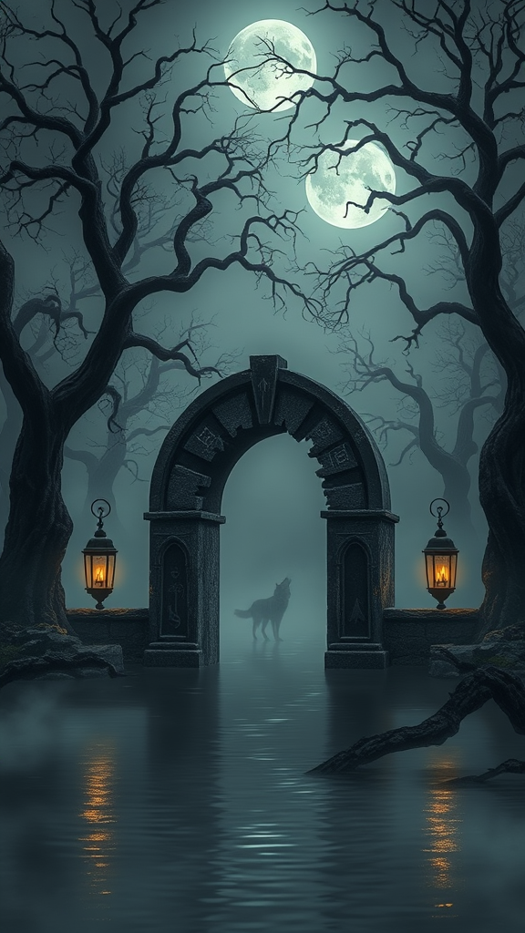 A haunting, surreal landscape bathed in eerie moonlight, where twisted trees with gnarled branches reach out like skeletal fingers, casting elongated shadows on the ground. The foggy air is thick with an unsettling silence, broken only by the distant howl of a lone wolf. In the foreground, an ancient, crumbling stone archway stands partially submerged in a murky pond, its surface gently rippling. Lanterns flicker dimly on either side of the archway, their pale light illuminating strange symbols etched into the stone. A sense of foreboding permeates this scene, inviting the viewer to explore its dark mysteries and hidden secrets.