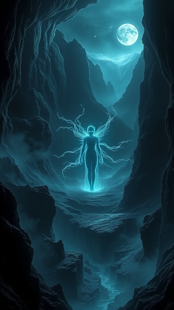 A haunting vista unfolds as an ethereal figure emerges from the depths of a shadowy chasm, its luminescent eyes piercing through the darkness like stars in a moonless sky. The spectral landscape is shrouded in swirling mists and jagged rock formations, hinting at an ancient, forgotten world where time stands still. Luminous tendrils of energy dance around the figure, casting an eerie glow that reveals the contours of a desolate terrain bathed in a palette of midnight blues and dusky purples. The air is thick with an otherworldly presence, as if the abyss itself holds a mysterious, lingering consciousness.
