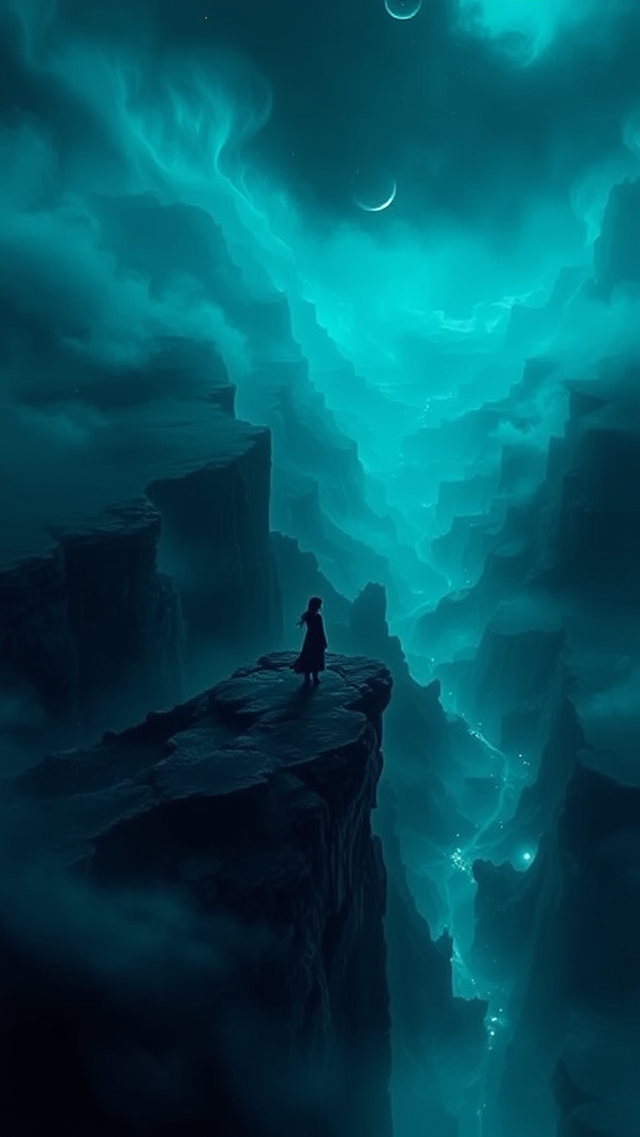 A haunting vista unfolds where a mysterious abyss beckons with its enigmatic allure; the depths shimmer with ethereal hues of midnight blue and emerald, while wisps of mist curl upwards like ghostly tendrils. Shadows dance across the landscape, hinting at secrets long forgotten, as distant ethereal lights drift lazily, casting an otherworldly glow. In the center, a solitary figure stands on the precipice, their silhouette bold yet delicate against the vastness, eyes reflecting an ancient wisdom and a quiet longing. The silent expanse stretches infinitely, inviting exploration and introspection in equal measure.