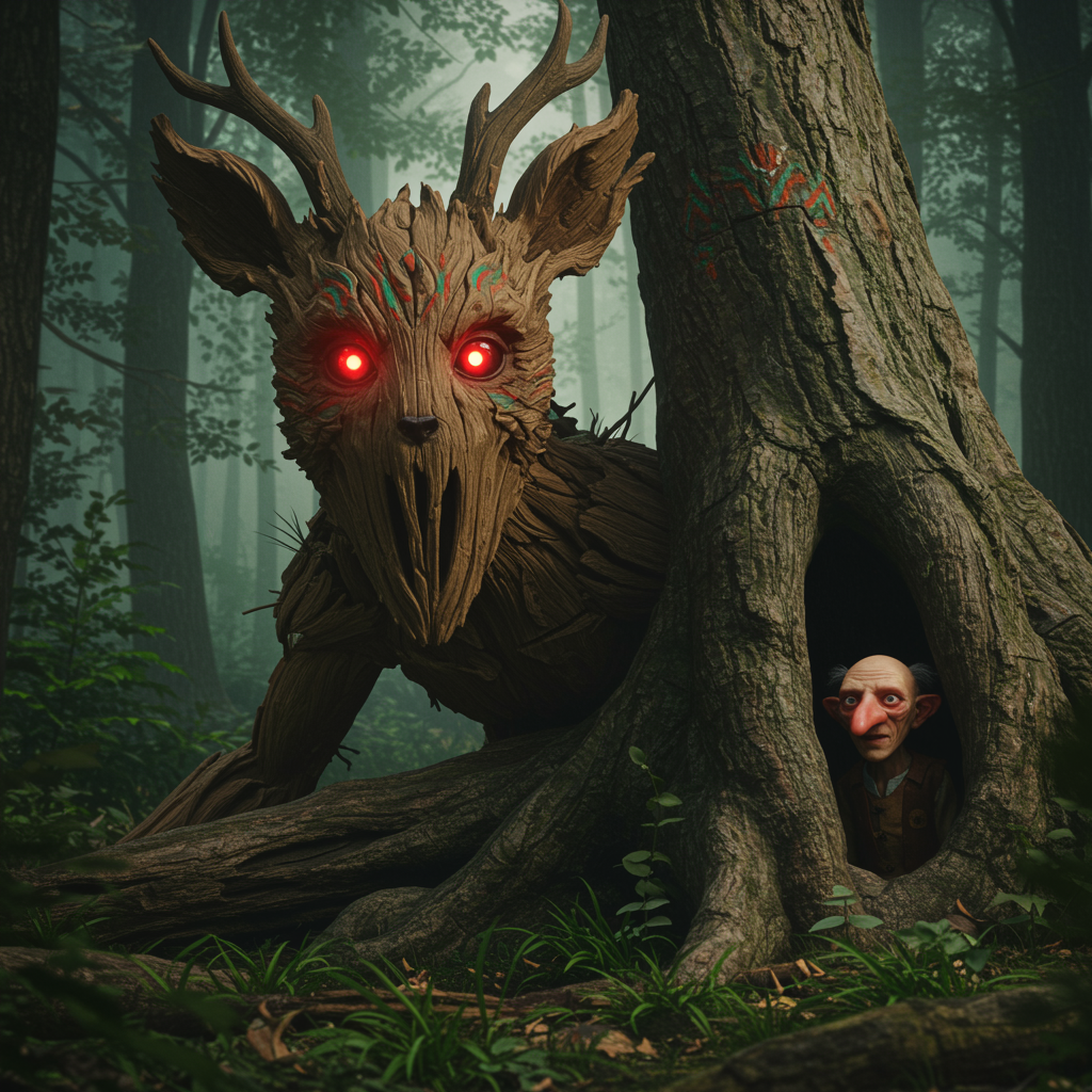 A haunting wood creature with a glowing crimson eye emerges from the shadows, its form blending seamlessly into the gnarled trunks of an ancient forest. The setting brims with mystique, reminiscent of a mysterious jungle and captured with hyper-realistic detail in the style of Filip Hodas, Sandy Skoglund, and Natalia Rak. The creature's surface displays colorful woodcarvings, a nod to vivid folklore patterns, while its Lovecraftian essence hints at unknown terrors. Alongside, a grotesque man with a prominent red nose lurks within the hollow of a massive tree, his presence eerily unsettling. The scene resonates with the intricate artistry of ZBrush and the vivid depiction found in characterful animal portraits. This hyper-detailed masterpiece, rendered in 32k UHD, captures the fusion of daz3d realism with the whimsical world of frogcore, inviting viewers to lose themselves in its enigmatic allure.