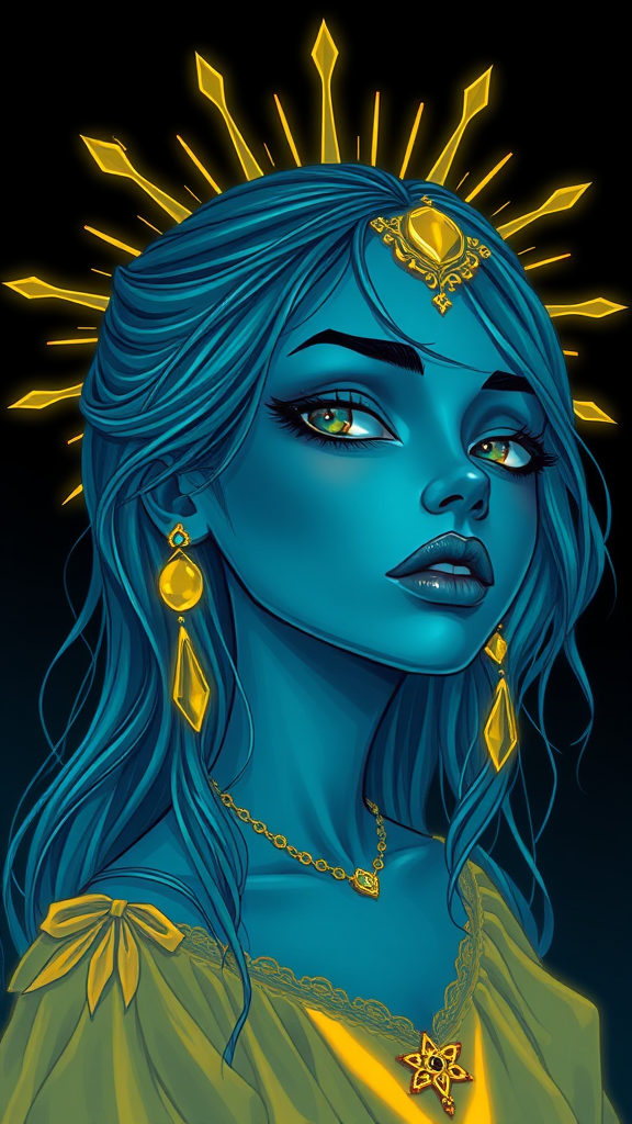 A hauntingly beautiful blue-skinned girl adorned with a radiant gold halo, depicted in a neon realism style combining darkly romantic and solarpunk elements, featuring a minimalistic cartoon elegance in dark white and yellow hues, exuding a brooding and captivating mood.