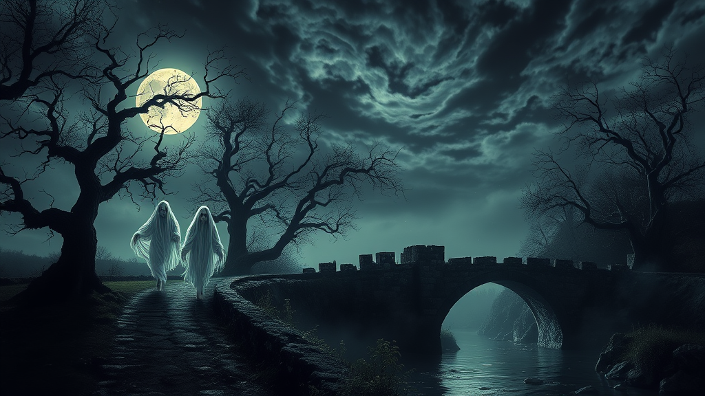 A hauntingly beautiful landscape bathed in moonlight, with gnarled, twisted trees casting long shadows over a foggy path. In the foreground, an ancient, crumbling stone bridge arches over a dark, serpentine river. Ghostly figures with ethereal, flowing forms hover near the bridge, their faces partially hidden beneath tattered, translucent veils. The sky is a tapestry of swirling dark clouds and distant stars, giving an eerie glow to the entire scene.