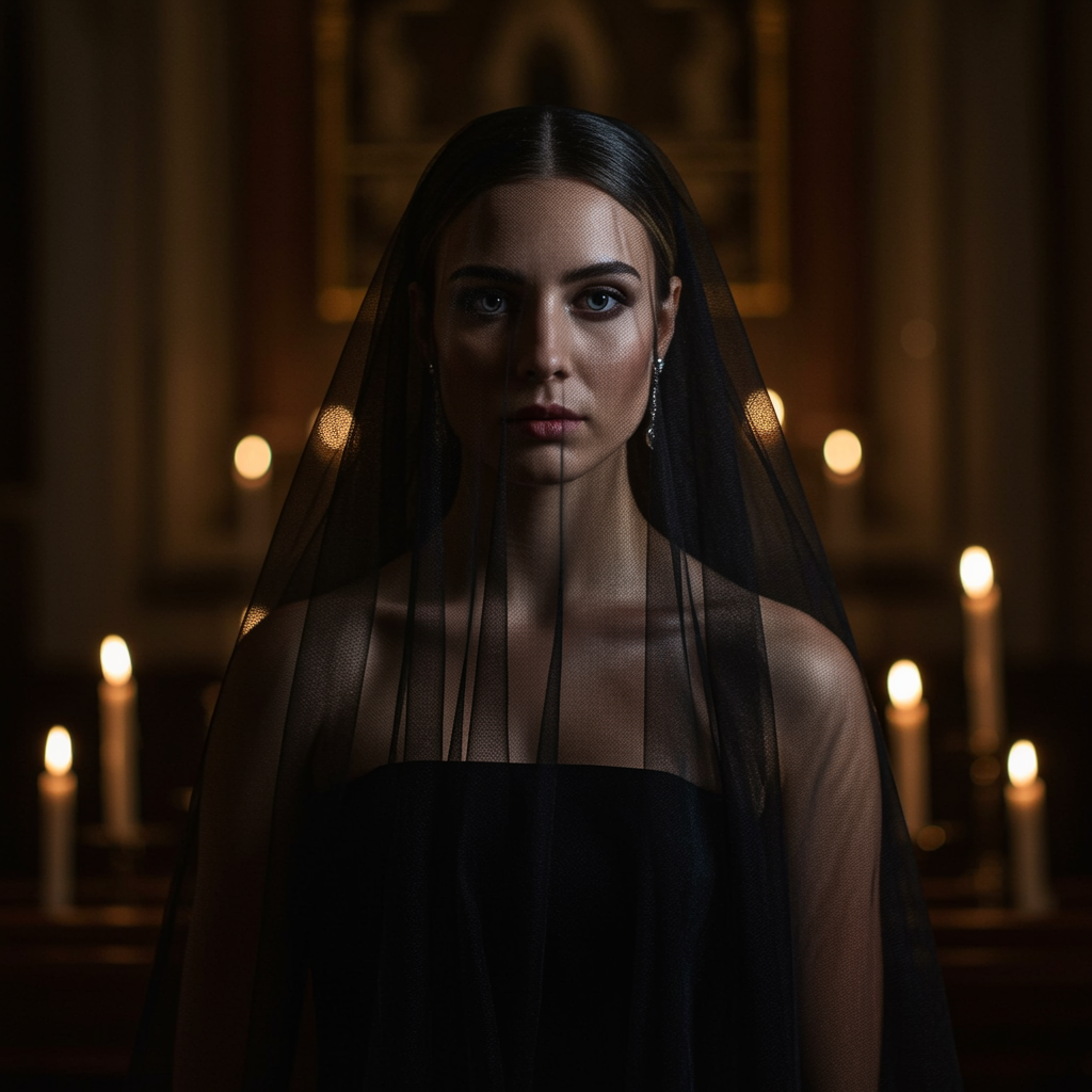 A hauntingly beautiful portrait inspired by the works of Nadav Kander and Annie Leibovitz captures a graceful Spanish widow enveloped in a flowing black veil, her features arranged with the precision of the golden ratio. Dramatic lighting casts soft shadows, echoing the grandeur of CinémaScope, while her confident expression and expressive eyebrows frame lovely, large, bright eyes. Her angelic face is adorned with simple yet elegant earrings and a delicate necklace, embodying understated elegance. The world around her seems paused in its beauty, as she stands in a dimly lit church with candles flickering, creating a warm bokeh effect. Her strapless dress holds a quiet sophistication, and intricate details bring every element to life, enhancing the photograph's depth and grace.