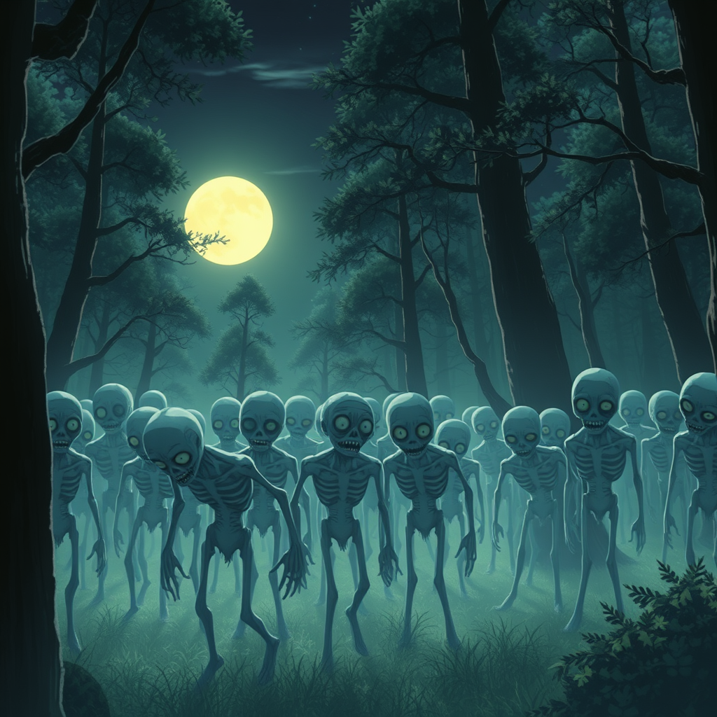 A hauntingly beautiful scene capturing a DVD screengrab from a retro anime inspired by Studio Ghibli, featuring a mesmerizing zombie horde designed in the signature style of Hayao Miyazaki. The surreal landscape is imbued with an eerie, ethereal glow, as softly detailed zombies with expressive eyes shamble gracefully through a moonlit forest. The blend of horror and whimsical elements creates an enchanting yet unsettling atmosphere, reminiscent of a classic animated fantasy with a dark twist.