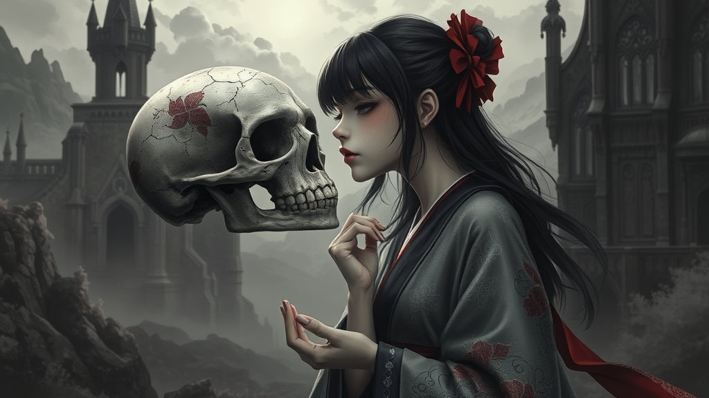 A hauntingly beautiful scene unfolds as a woman with delicate anime-inspired features leans forward to kiss an ornate, weathered skull. In a fusion of Japanese-inspired art and gothic elements, her flowing kimono dances with intricate patterns of gray and crimson. The background evokes Andreas Rocha's style, with sweeping landscapes bathed in moody shades of black and white, creating a strong sense of realism. Her ebony hair cascades like ink, contrasting beautifully with the stark whiteness of the skull. Gothic architecture looms in the periphery, casting eerie shadows that dance across her serene expression. The portrait captures a moment of poignant connection, where life and death converge in harmonious stillness.