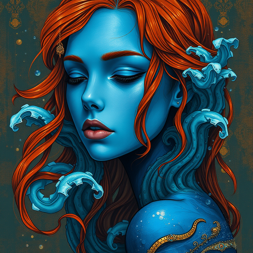 A hauntingly beautiful woman adorned in blue paint, her red hair cascading in waves reminiscent of ocean currents. Her distinct facial features are a stunning blend of hyperrealistic marine life and fantasy, with serene expressions that evoke a sense of calm. She is surrounded by a shimmering palette of dark gold and orange, adding a touch of ethereal warmth to the depiction. The illustration captures a delicate balance between real and imaginary, creating a mesmerizing and otherworldly visual experience.