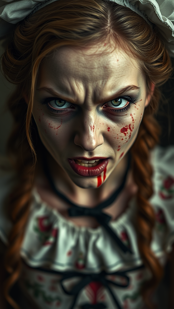A hauntingly beautiful woman dressed as a sinister version of Alice in Wonderland, age 30, exudes an unsettling, menacing aura as she glares at the viewer. Her expression is fiercely angry, and her attire is splattered with crimson stains. Captured in a realistic, highly detailed 8k photograph, every pore of her lifelike skin is visible, enhanced by expertly diffused soft lighting, and a shallow depth of field. The sharp focus and hyperrealistic, cinematic CGI lighting bring her to life in a full-length frame, blending 3D realism with a chilling vibe. The image possesses an artistic RAW color quality, subtly hinting at an eerie narrative, free from any distracting elements like poor quality or visual errors, ensuring a captivating and immersive experience.
