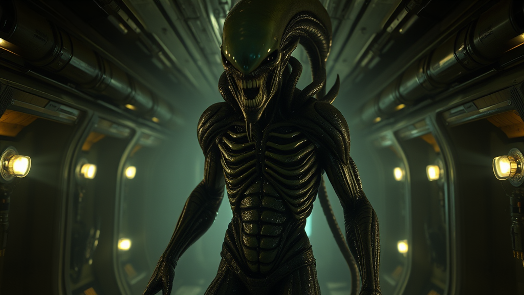A hauntingly detailed alien creature with intricate alien skin and garb stands poised aggressively in a steamy, intricately rendered spaceship corridor. The sci-fi scene is lit by flickering halogen lamps casting muted dark hues, creating a high dynamic range ambiance. The creature, sultry and commanding, has a perfectly sculpted face and body adorned with alien tattoos and scars, suggesting a history of battles. Its skin appears oil-greased and reflective, with droplets of water rolling down, reminiscent of the moist interiors of The Alien film franchise. The surroundings and entity are portrayed in hyperrealistic detail, with reflective textures and highly detailed features prominent in a style inspired by HR Giger, Aaron Horkey, and Jeremy Mann. The imagery channels an analog and raw aesthetic captured in 8K UHD using octane rendering, professionally color graded with a muted LUT for a chilling atmospheric tone. Despite the creature's unsettling presence, its aesthetic remains a masterpiece of photorealism and concept art, exuding both fear and fascination.