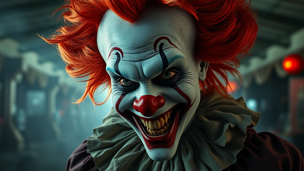 A hauntingly detailed photograph captures a sinister clown with an aura of malevolent darkness. Its vivid makeup is a grotesque symphony of smeared colors, contrasting against the ghostly pallor of its skin. Sinister eyes, glowing with an unholy fire, peer out from beneath unruly, fiery red hair, telling tales of wicked laughter and torment. A twisted smile, filled with cruel mirth, reveals sharp, yellowed teeth, hinting at the clown's diabolical nature. The setting is an abandoned, dimly lit carnival, shrouded in thick, eerie mist, enhancing the clown's menacing presence as it stands out in vivid, hyper-realistic detail, embodying an evil soul condemned to perpetual mischief and chaos.