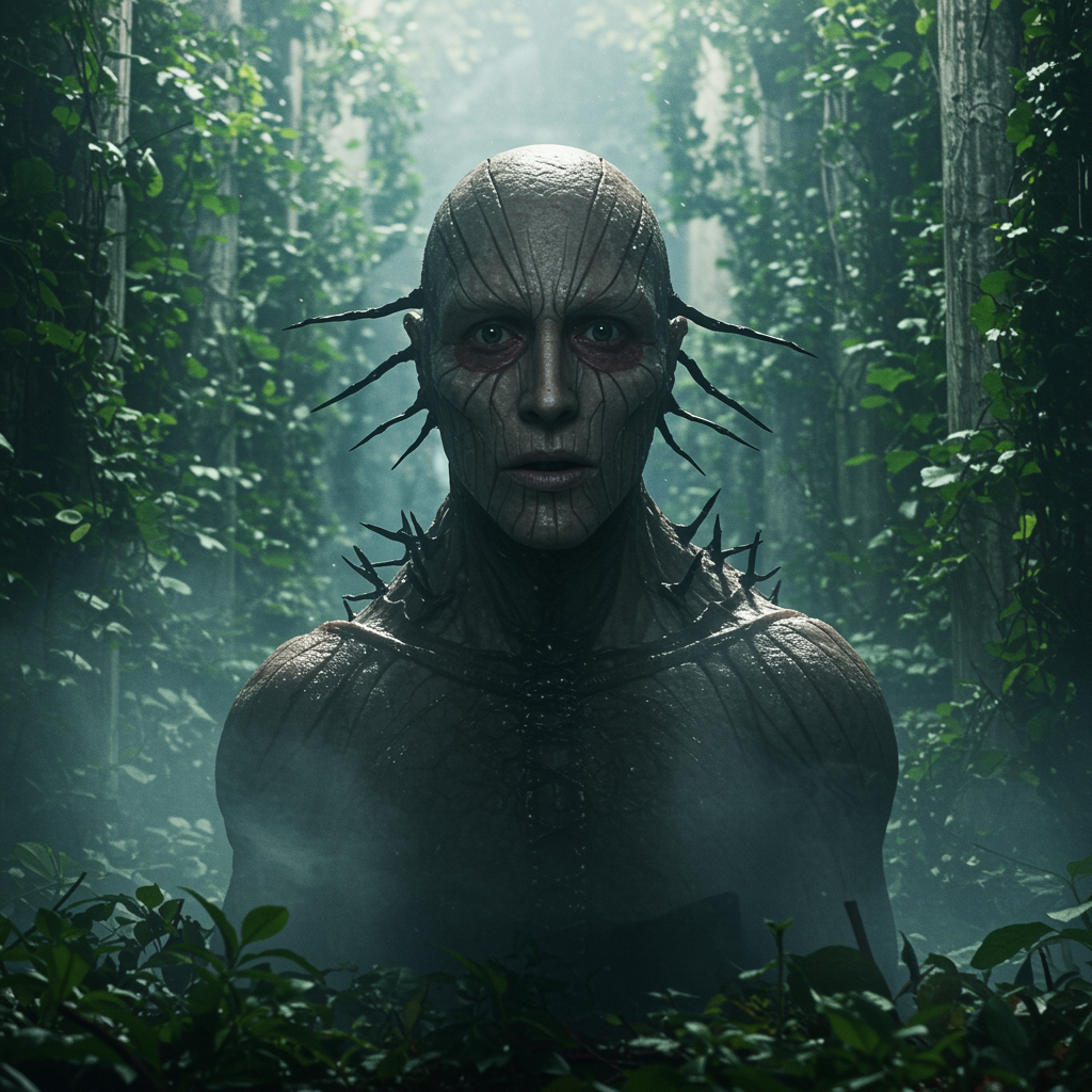 A hauntingly detailed portrait of the horseman of the apocalypse, Hunger, emerges in a fusion of fog and gleaming metal. The character's face, intricately lined and expressive, captures a sense of unending desire and desperation. Set against a lush, yet decaying environment, the light glimmers with a cinematic intensity, casting eerie reflections off damp surfaces. The scene evokes apocalypsecore's compelling tension—an interplay of ruin and regrowth. Annie Leibovitz's signature portraiture style lends depth to the powerful imagery, an artistic collaboration with retoucher Pratik Naik ensures every detail is flawless, enhancing the stark realism that borders on the mythical.
