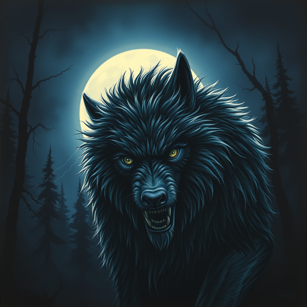 A hauntingly detailed portrayal of a werewolf under the full moon, its eyes glinting with an eerie intelligence and fur bristling in the night breeze, set against a shadowy, moonlit forest landscape with elongated, mystical proportions and a subtle, ethereal glow that adds depth to the scene, capturing the tension and mystery of the creature's transformation.