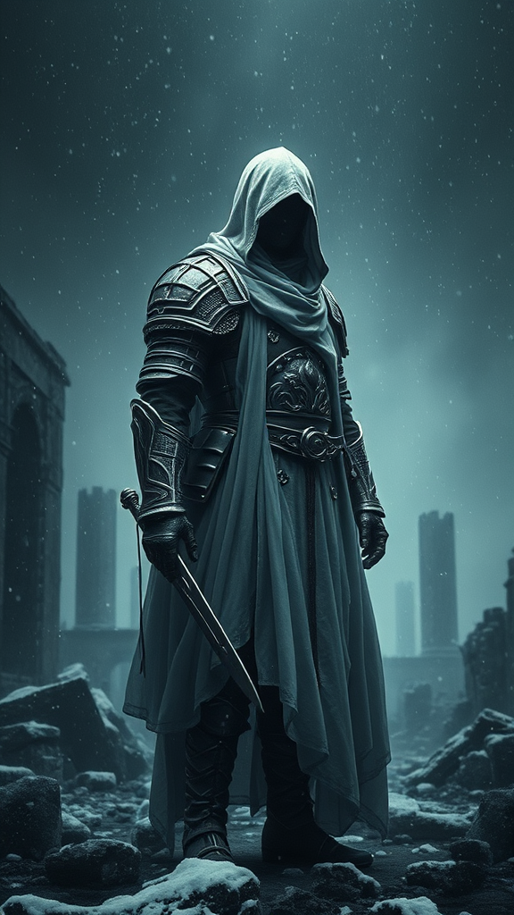 A hauntingly elegant half-body portrait of a legendary warrior cloaked in ghostly armor, standing alone amidst desolate ruins. The warrior's face is obscured, emanating an aura of mystery and solitude as snow falls gently in a stormy, dramatic scene. The composition is brutal yet breathtaking, with digital artistry reminiscent of Eugene de Blaas and Ross Tran. Bathed in a dramatic, gloomy light that highlights the dark, misty atmosphere, the piece is calm yet powerful, embodying a romantic and cinematic quality akin to the works of Greg Rutkowski. Highly detailed, the image captures the essence of a forgotten warrior, conveying elegance and brutality in equal measure. The surreal environment is rendered with absurd resolution, with elements intentionally left raw to enhance the mythic and unforgettable quality of this extraordinary painting.