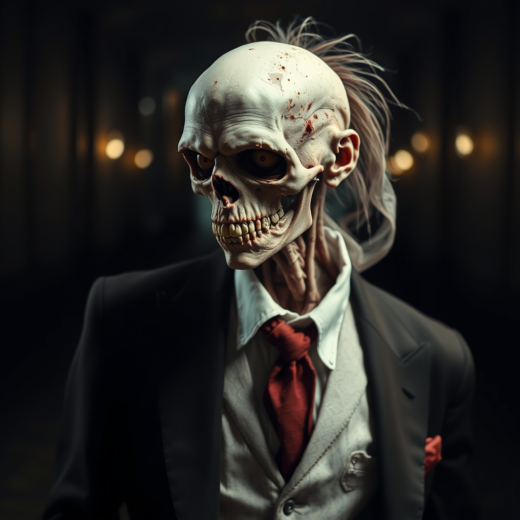 A hauntingly elegant male zombie, half-decayed and ghastly, draped in a tattered vintage suit, resembling a spectral figure; the art captures the essence of Annie Leibovitz’s style with a full-body portrait. His striking bone structure evokes a tragic beauty, set against a gothic backdrop with cinematic lighting. The scene is meticulously detailed, highlighting the character's eerie yet captivating presence, as if lit by the expert touch of a lightroom.