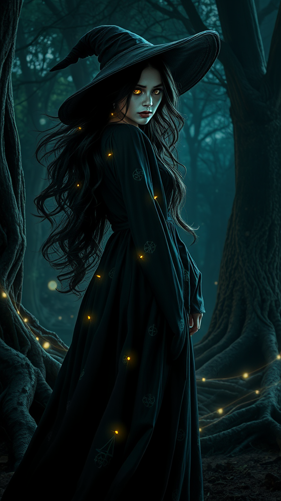 A hauntingly enchanting witch stands at the edge of an ancient forest, her dark, flowing robes swirling with the whispers of the night, illuminated by flickering fairy lights that dance through her hair. Her eyes gleam with a mysterious allure, reflecting the intricate patterns of arcane symbols etched delicately into her skin. The scene is bathed in volumetric lighting, casting ethereal beams that highlight the hyper-realistic textures of her surroundings, from the gnarled roots of towering trees to the soft, luminescent glow of distant orbs. It's a hyper-realistic masterpiece, rich with HDR detail, where every fold of fabric and strand of hair is rendered with breathtaking precision, creating an atmosphere both alluring and foreboding.