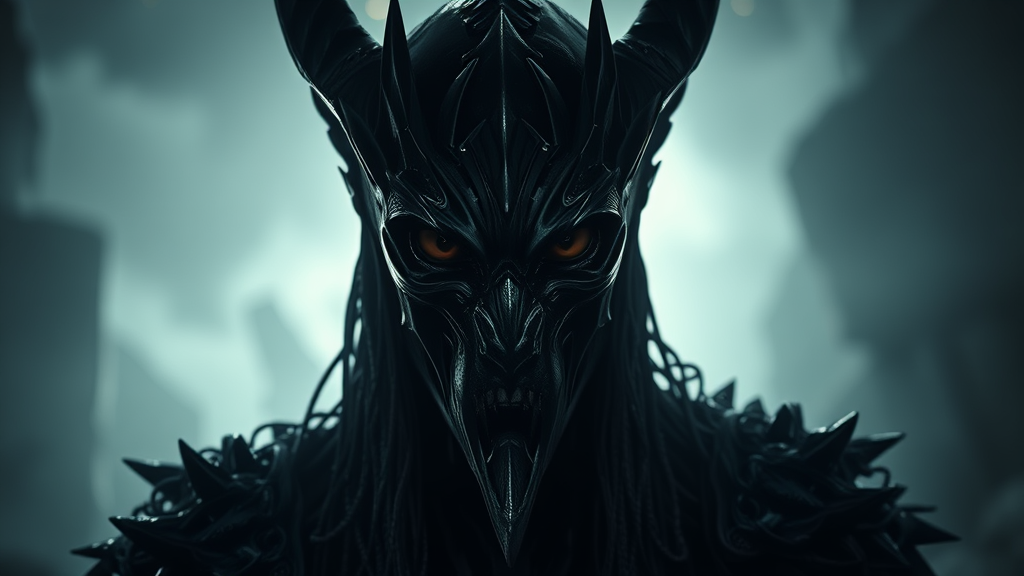 A hauntingly glamorous portrait of Sauron, shrouded in a morbid, dark aura, exquisitely detailed, rendered in octane. The scene is wet and dense with atmospheric tension, creating an epic, dramatic void. The setting feels unsettling and vacant, reminiscent of eerie trail cam footage. The image is photorealistic with hyperornate detailing, capturing the essence of John Tolkien's vision. Imagined through the lenses of photographers Irakli Nadar and Reylia Slaby, the composition is an elongated 9:16 aspect ratio, emphasizing an intense and atmospheric presence.