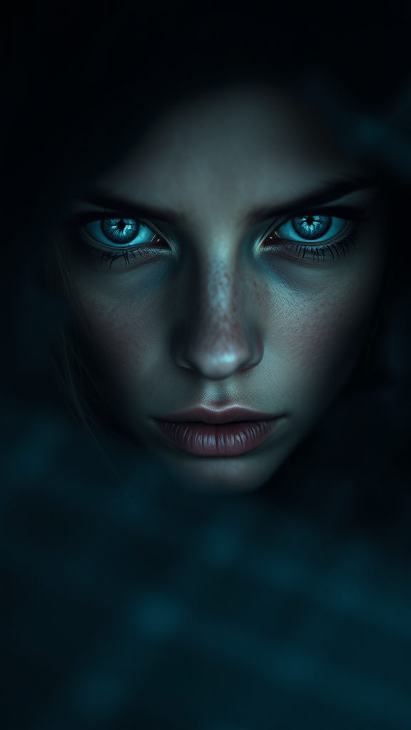 A hauntingly hyperrealistic portrayal of a mysterious woman, her piercing arctic blue eyes providing an intense focal point amidst a shrouded atmosphere of shadowy allure. The minimal lighting casts deep contrasts, enriching the dark aura that envelops her, while the finely detailed features and masterful use of depth of field draw the viewer into a scene of enigmatic beauty and intrigue.