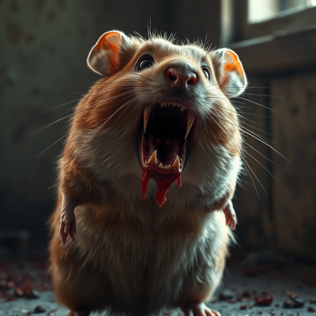 A hauntingly lifelike elderly hamster with disturbingly detailed skin stands in the dim glow of natural light, its presence unsettling against a backdrop of shadowy, decaying walls. Its open mouth reveals unnaturally large, pointed teeth, each dripping with fresh blood, creating a macabre contrast against its matted fur. Its black, soulless eyes exude an eerie emptiness, and a jagged scar mars its right cheek, adding to the creature's sinister allure. The air around it is thick with an unsettling silence, as if even the darkness hesitates to encroach upon its horrific presence.